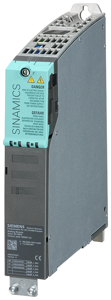SINAMICS Braking Module compact Input: DC600V Output: Pdb/Pmax 5/100kW Braking Module SINAMICS Braking Module in Booksize Compact format for the SINAMICS S120 converter system. A Braking Module and the matching external braking resistor are required to bring drives to a controlled standstill in the event of a power failure (e.g. emergency retraction or EMERGENCY STOP category 1) or limit the DC link voltage for brief periods of generator operation, e.g. when the regenerative feedback capability of the Line Module is deactivated. In addition, the Braking Module contains the power electronics and the associated control and also functions autonomously. During operation, the DC link power is converted into heat loss in an external braking resistor. Parallel operation of multiple Braking Modules in Booksize Compact format is possible, however, each Braking Module must feature its own braking resistor in this regard. Braking Modules in Booksize Compact format can also be used for rapid discharge of the DC link. The Braking Module in Booksize Compact format is available with a DC link voltage of 510 V to 720 V. Additionally, 4 distance bolts and caution signs in 30 languages are included in the order. This set of foreign language warning signs can be placed on top of the standard English and German signs. SINAMICS †the integrated drive family for every field of application.